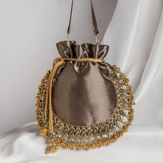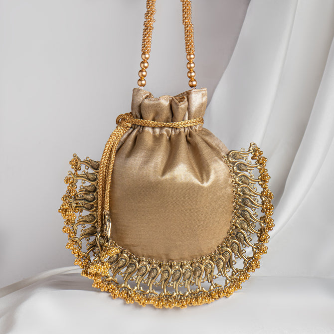 Copper Tissue Silk Metal Peacock Gota Hand Embroidry Work Potli Bag