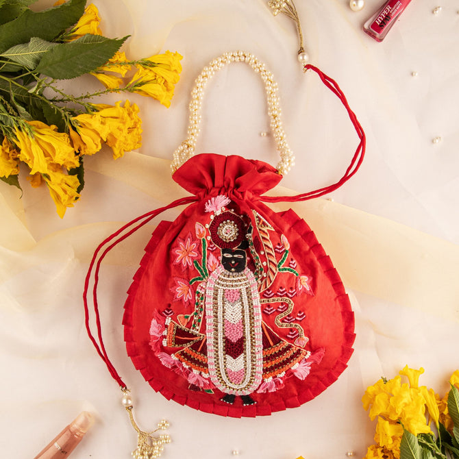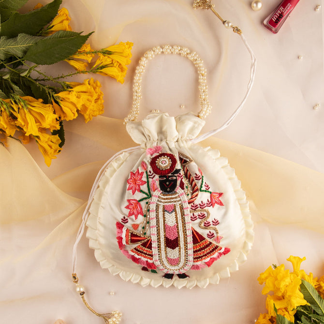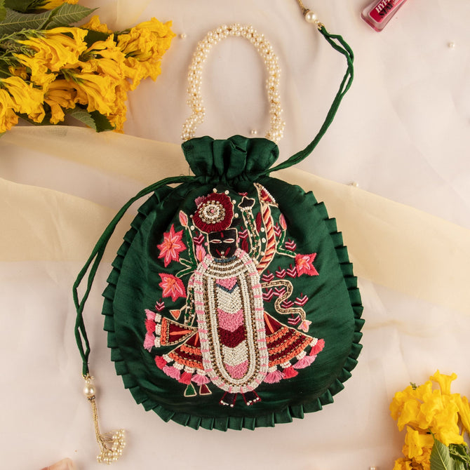 Indian Srinath Ji God Tradtional Zardosi Work Beaded Potli Bag