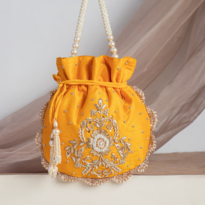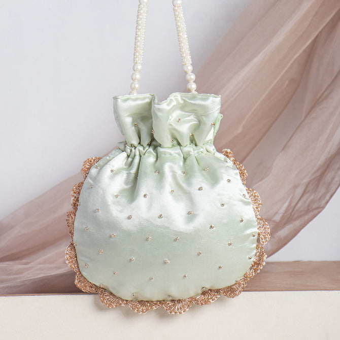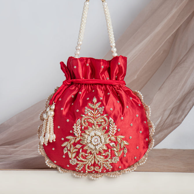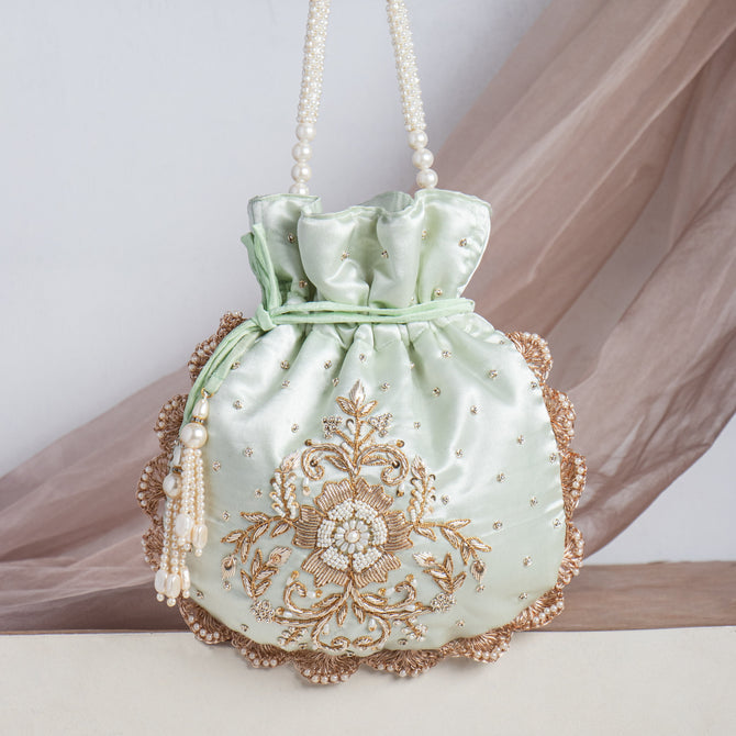 Silk Pearl Beaded Zardozi Hand Embroidry Work Potli Bag